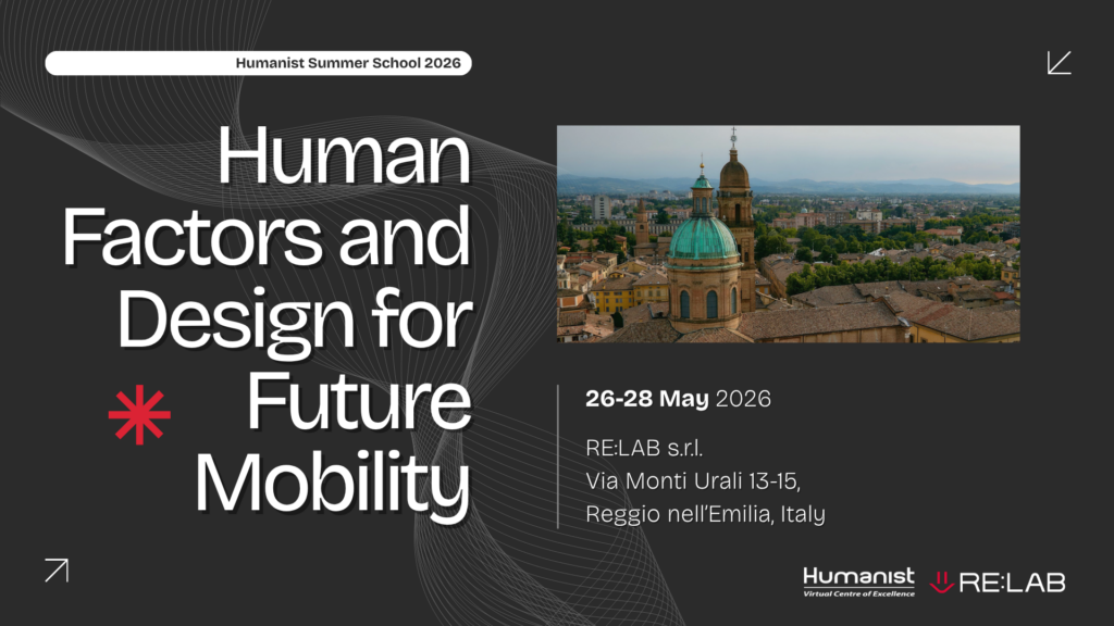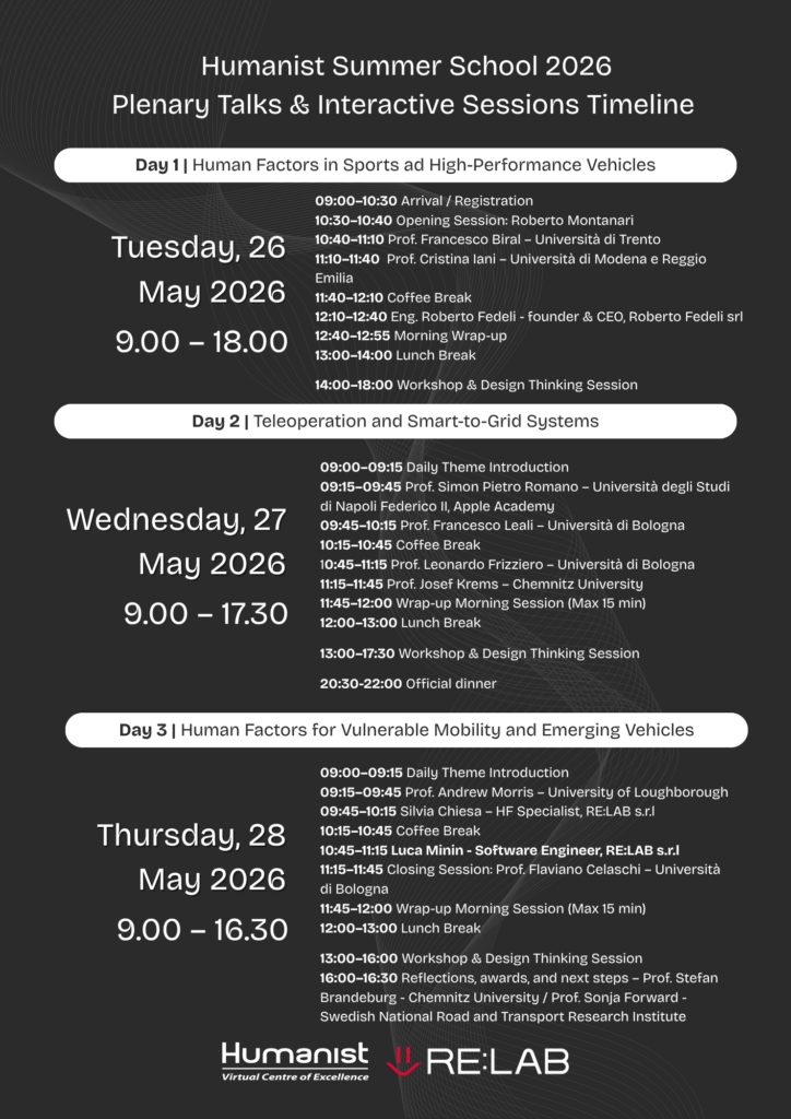 We’re happy to announce the programme and CfP of the 2026 HUMANIST Summer School at RE:LAB s.r.l. in Reggio nell’Emilia, Italy (May 26th-28th 2026). The Summer School is structured as an intensive three-day course, each day dedicated to a specific topic in the field of Human Factors applied to the automotive and transport sectors (see flyer attached to this email). The aim is to create a space for concrete discussion between academia and industry, promoting the exchange of skills, methodologies, and operational experiences. Each day is divided into two complementary parts: